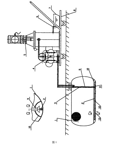 預先得知防爆儲罐內的存儲油(介質)使用底線(即加油機抽不到油為止,如25M3的防爆儲汽油罐,剩余油量約為0.8M3)。此時打開防爆儲罐1人孔蓋,將豎井內的防爆材料和豎井下部的清污隧道10移出罐外;將吸油管9(最好使用單個吸油管)插入到清污隧道10內,啟動氣動隔膜泵4將清污隧道10內剩余油污輸送給自動清洗過濾器5進行過濾,過濾后的清潔油不送回防爆儲罐,另外儲存到容器內,直到將清污隧道內的油污抽完為止。然后將設計多段的噴射橫管2放入到清污隧道10內。由于豎井的尺寸有限,噴射橫管2中間設計為能通過豎井放入到清污隧道10內為好,其余兩段或多段的噴射橫管與中間段噴射橫管用對接管頭對接一體,并用卡箍固定好清污隧道10內,再將噴射豎管2和吸油管9與其連接(如使用同心的噴射豎管3和吸油管9是應將單個吸油管取出),并將與豎井固定好,同心的噴射豎管3和吸油管9快速接頭14應由盲板保護。這里說明的是同心設置的噴射管和吸油管只是安裝到位,為下一次清污作業(yè)使用的。