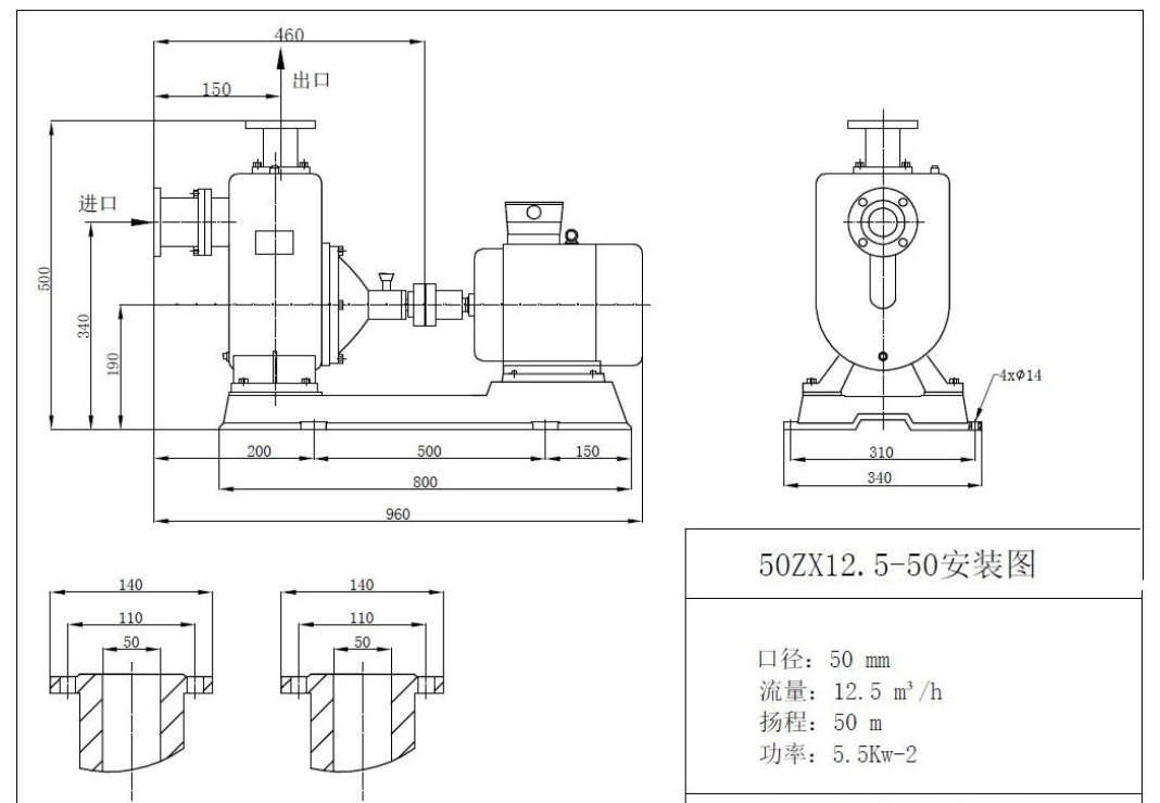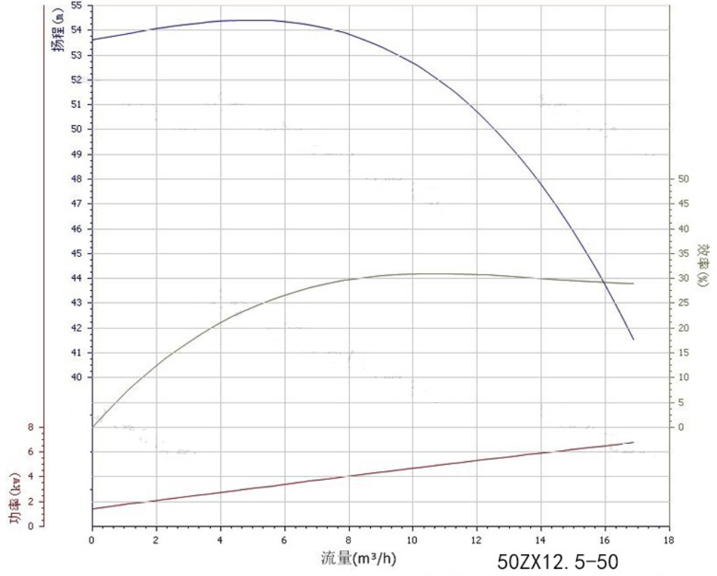 50ZX12.5-50自吸泵型號前面的50代表進出口口徑為50mm、ZX表示為自吸式離心泵、12.5代表額定流量12.5立方米每小時、50表示泵的額定揚程50米、自吸高度為5米,配用5.5KW功率電機。如果用戶要求吸程較高,還可以加裝真空輔裝置,做成吸程可達9米的高吸程自吸泵。應當注意的是,因為自吸泵參數(shù)是使用清水測試而得出的,但在使用中會因為輸送介質(zhì)的粘度及管道損耗等原因,導致實際使用中流量、壓力參數(shù)減小。所以在選型的時候應當留有一些余量,尤其在工況要求揚程必須達到50米時,建議選大一個自吸泵型號,選擇50ZX15-60自吸離心泵使用。